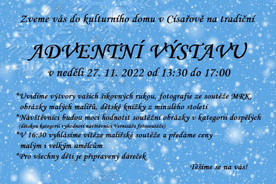 Obec Císařov zve na adventní výstavu do kulturního domu v Císařově v neděli 27.11.2022 od 13:30 hod. Více informací na přiloženém letáčku.
