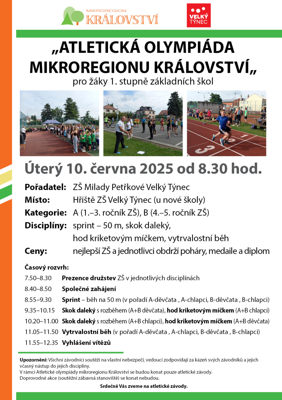 Mikroregion Království vás zde na Atletickou olympiádu, kterou pořádá tradičně ve Velkém Týnci v úterý 10.6. 2025. Podrobnosti jsou v přiloženém plakátku.
