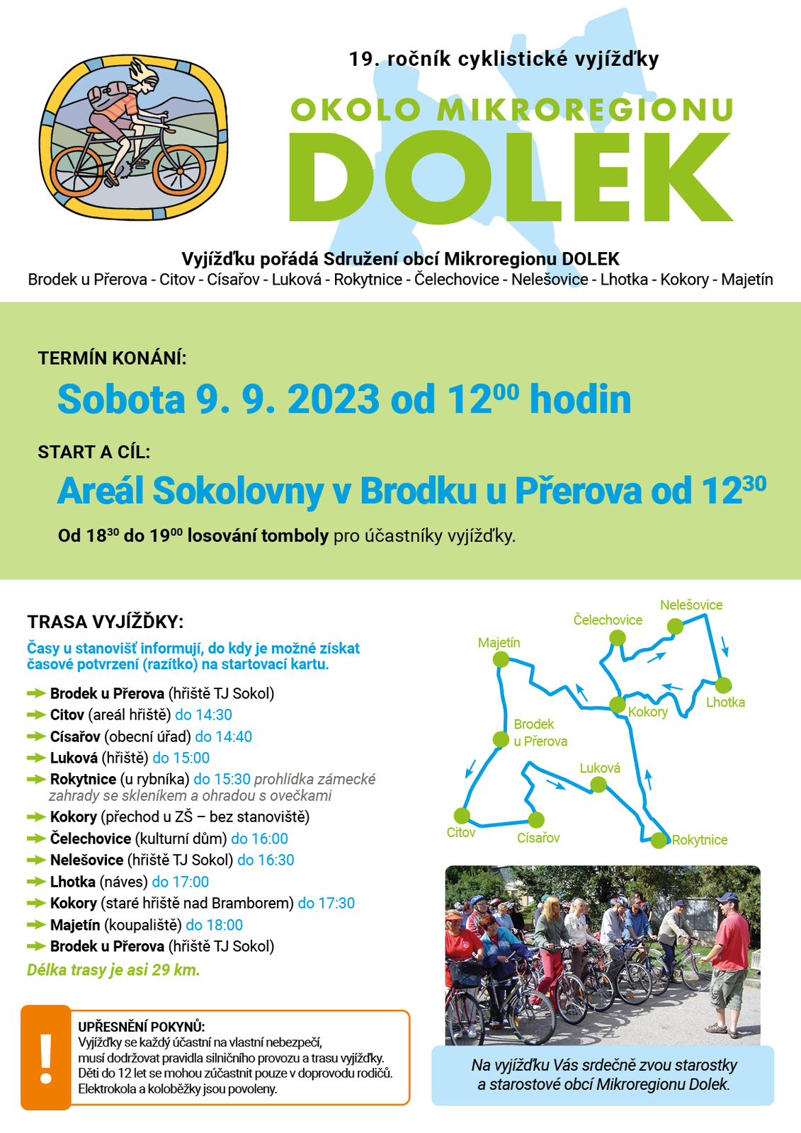 Sdružení obcí Mikroregionu Dolek zve na 19. ročník cyklistické vyjížďky okolo mikroregionu Dolek, která se uskuteční v sobotu 9.9.2023 od 12 hod. Start a cíl je v areálu Sokolovny v Brodku u Přerova. Více informací na přiloženém letáčku.