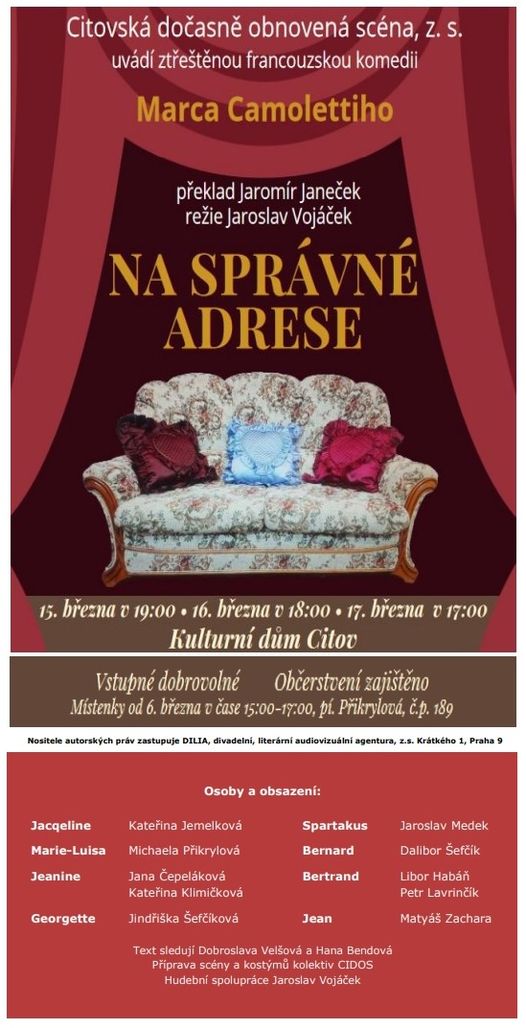 Citovská dočasně obnovená scéna (CIDOS) srdečně zve své příznivce na ztřeštěnou francouzskou komedii Marca Camolettiho „NA SPRÁVNÉ ADRESE“. Představení proběhnou v kulturním domě v pátek 15.3. (premiéra), v sobotu 16.3. a v neděli 17.3. Veřejná generálka se uskuteční ve čtvrtek 14.3. od 19:00 hodin. Místenky bude možno od 6. do 13. března vyzvednout u Míši Přikrylové, Citov 189, vždy v čase 15:00 – 17:00 hodin. Vstupné dobrovolné, občerstvení bude jako vždy zajištěno. Časy představení a další informace naleznete na plakátu.