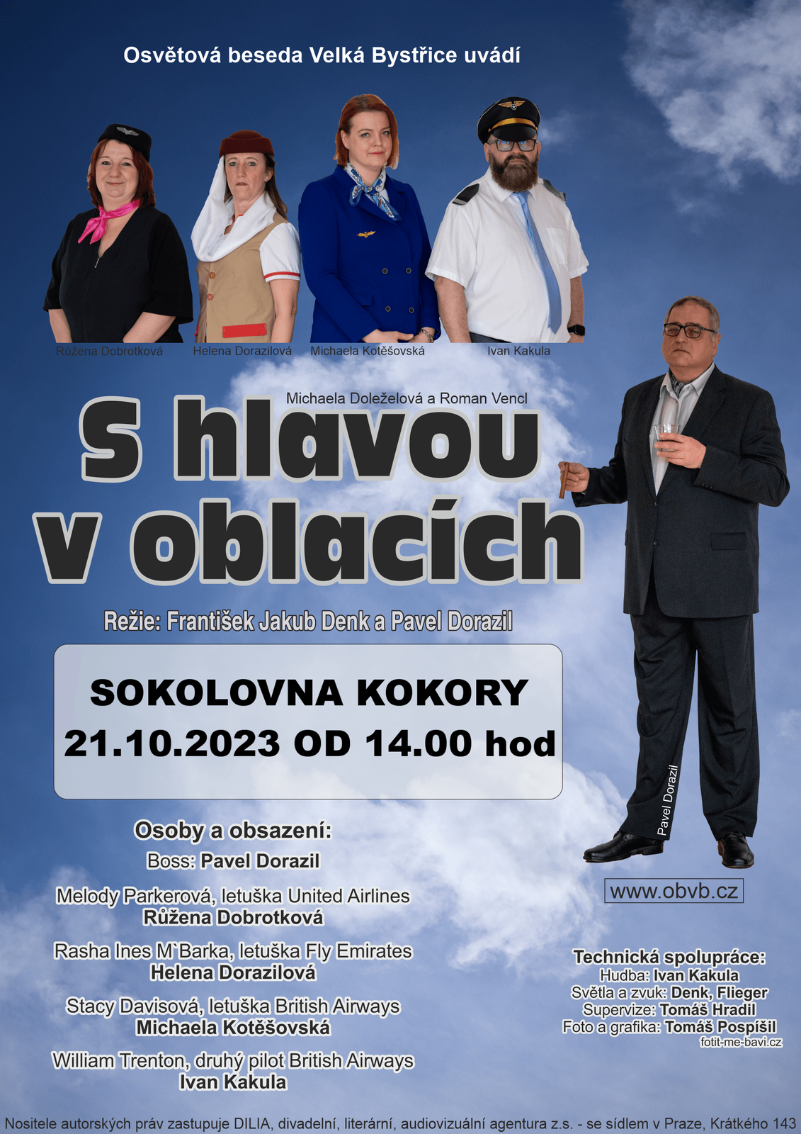 Centrum Dominika Kokory, p. o. Vás srdečně zve na divadelní představení "S hlavou v oblacích" konané dne 21.10.2023 v sokolovně v Kokorách. Bombová komedie z pera Michaely Doleželové a Romana Vencla o téměř dokonalém zločinu, o letuškách, s nádechem a tempem hollywoodského akčního trháku. Vstup zdarma.