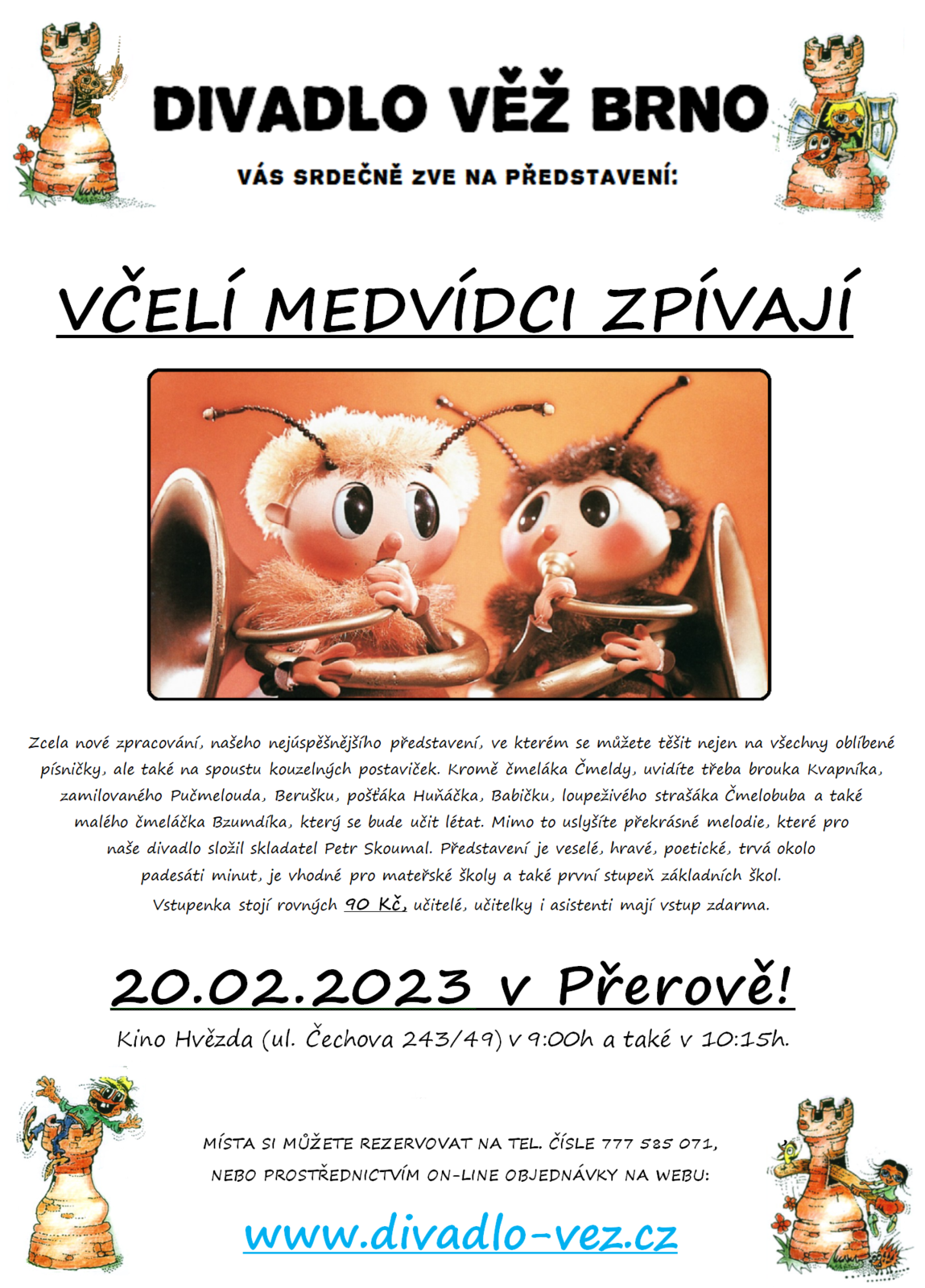 Divadlo Věž Brno zve na veselé, pohádkové představení Včelí medvídci zpívají, které proběhne 20.2.2023 v Přerově. Více informací na přiloženém letáčku.