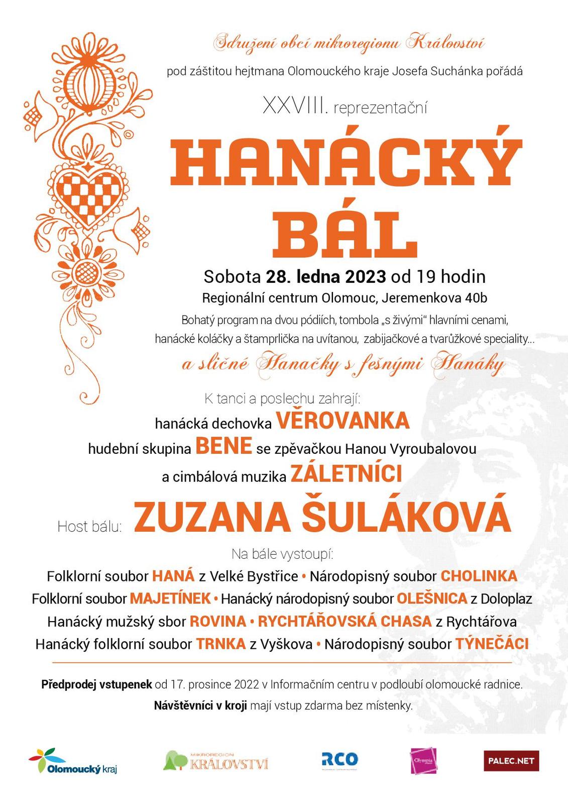 Sdružení obcí mikroregionu Království zve na Hanácký bál, který se uskuteční 28.1.2023 od 19 hod. v Regionálním centru v Olomouci. Podrobnější informace na přiloženém letáčku.