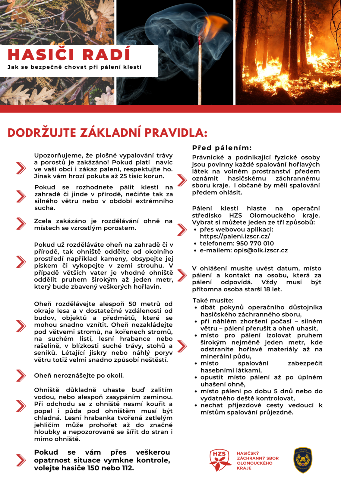 Hasičský záchranný sbor Olomouckého kraje zasílá další část seriálu Hasiči radí, tentokrát na téma "Pálení s rozumem, aneb Hasiči radí jak se chovat při pálení klestí". Další informace jsou umístěné na internetových stránkách HZS Olomouckého kraje: