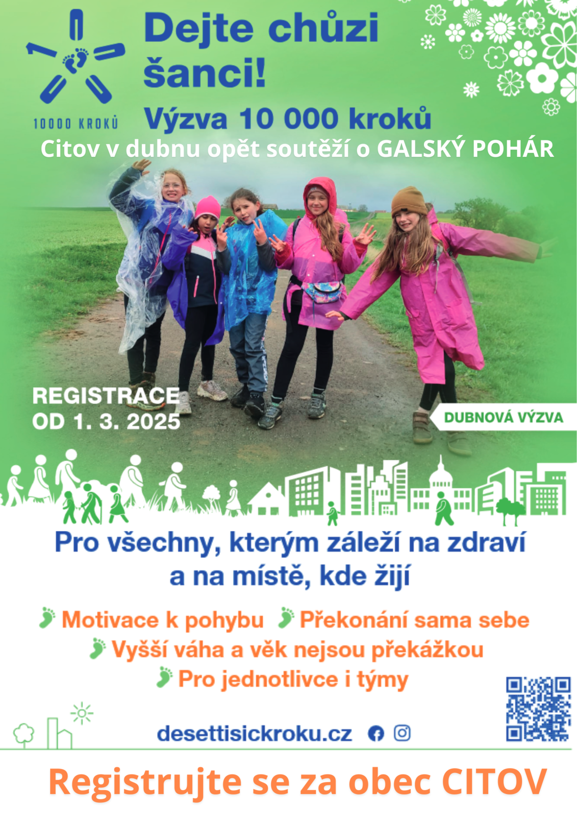Naše obec se zúčastní v měsíci dubnu jarní výzvy @10.000 kroků, která je pro nás motivací k pravidelnému pohybu a přispíváme tak ke zdraví nás i našich měst. Společně budeme svými kilometry soutěžit v kategorii malá obec o Galský pohár! Můžete se přihlásit hned teď, soutěžit zdravým pohybem v dubnu za Citov, případně si postavit tým, vyzvat sousedy! Více na???? www.desettisickroku.cz/