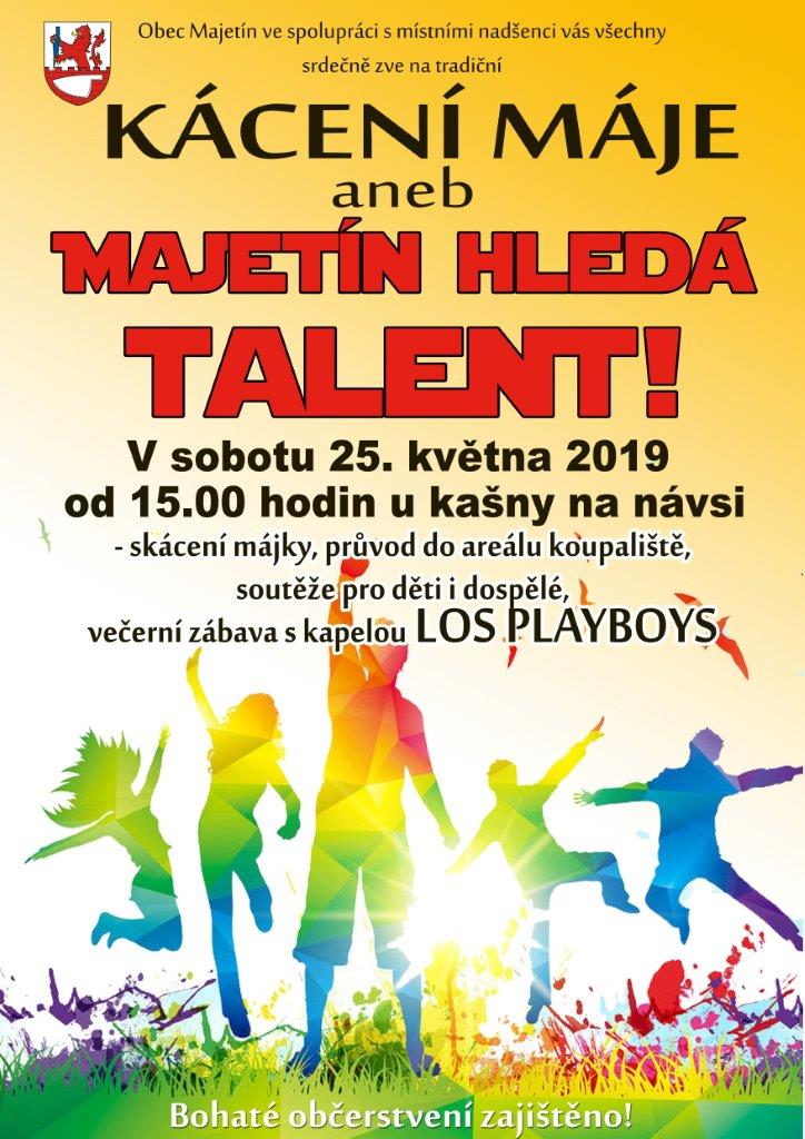 Obec Majetín ve spolupráci s místními nadšenci všechny zvou na Kácení máje anebo Majetín hledá talenty. Akce proběhne v sobotu 25.5.2019 od 15 hod. u kašny na návsi. Více na přiloženém letáčku.
