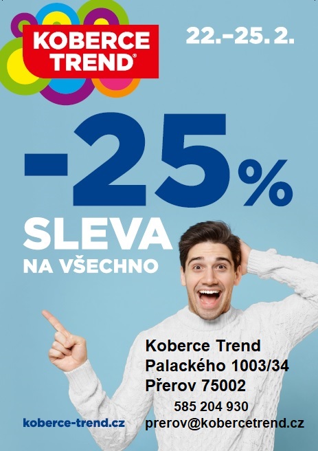 Prodejna Koberce Trend Přerov informuje o mimořádné akci mínus 25% na všechno zboží. Akce se koná ve dnech 22. - 25.2.2023.