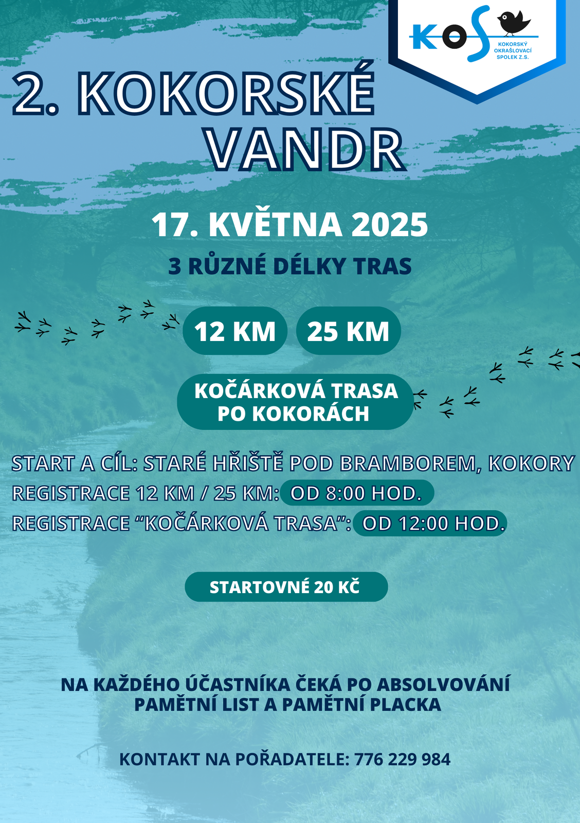 Kokorský okrašlovací spolek z.s. Vás zve na 2. ročník Kokorského vandru, který se bude bude konat v sobotu 17. 5. 2025. Start a cíl bude na starém hřišti Pod Bramborem v Kokorách. Délky tras jsou 25, 12 nebo 3 km. Cílem akce je podpora zdravého životního stylu a podpora pěší turistiky s poznáváním krás našeho mikroregionu. Celá akce je za podpory Klubu českých turistů, za absolvování jakékoliv trasy si účastníci odnesou pamětní placku a diplom. Odkaz na událost na Facebooku: https://www.facebook.com/events/649194784411183.