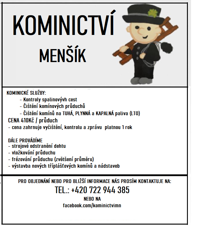 Kominictví Menšík bude v naší obci 14.3.2023 provádět kontroly a čištění komínů, spalinových cest, po domluvě i frézování, vložkování či výstavba nových komínových těles. Cena za čištění a kontrolu i se zprávou o provedení kontrol a čištění činí 410,-Kč. Zájemci se mohou objednávat u naší operátorky na telefonním čísle +420 722 944 385, facebook: facebook.com/kominictvimn