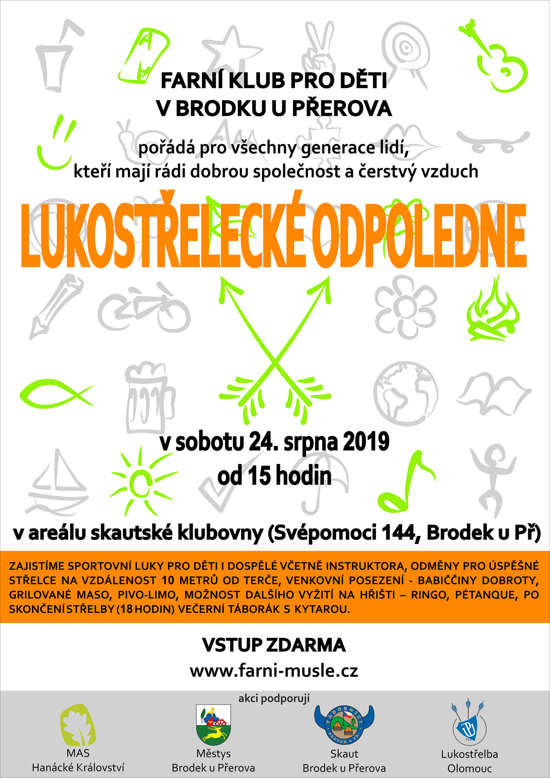 Brodecký farní klub pro děti pořádá v sobotu 24. srpna 2019 oblíbené lukostřelecké odpoledne v areálu skautské klubovny v Brodku u Přerova. Začátek je v 15 hod. Více informací na přiloženém letáčku.