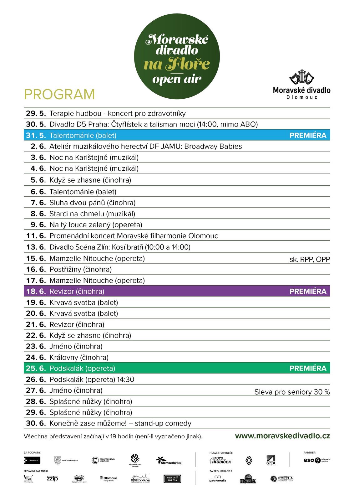 Moravské divadlo Olomouc nabízí program open air scény s názvem Moravské divadlo na Floře, které zahájí již 29. května na Výstavišti Flora, v areálu Samba. V příloze naleznete programový plakát.