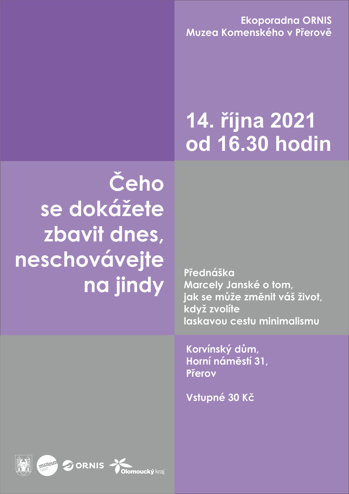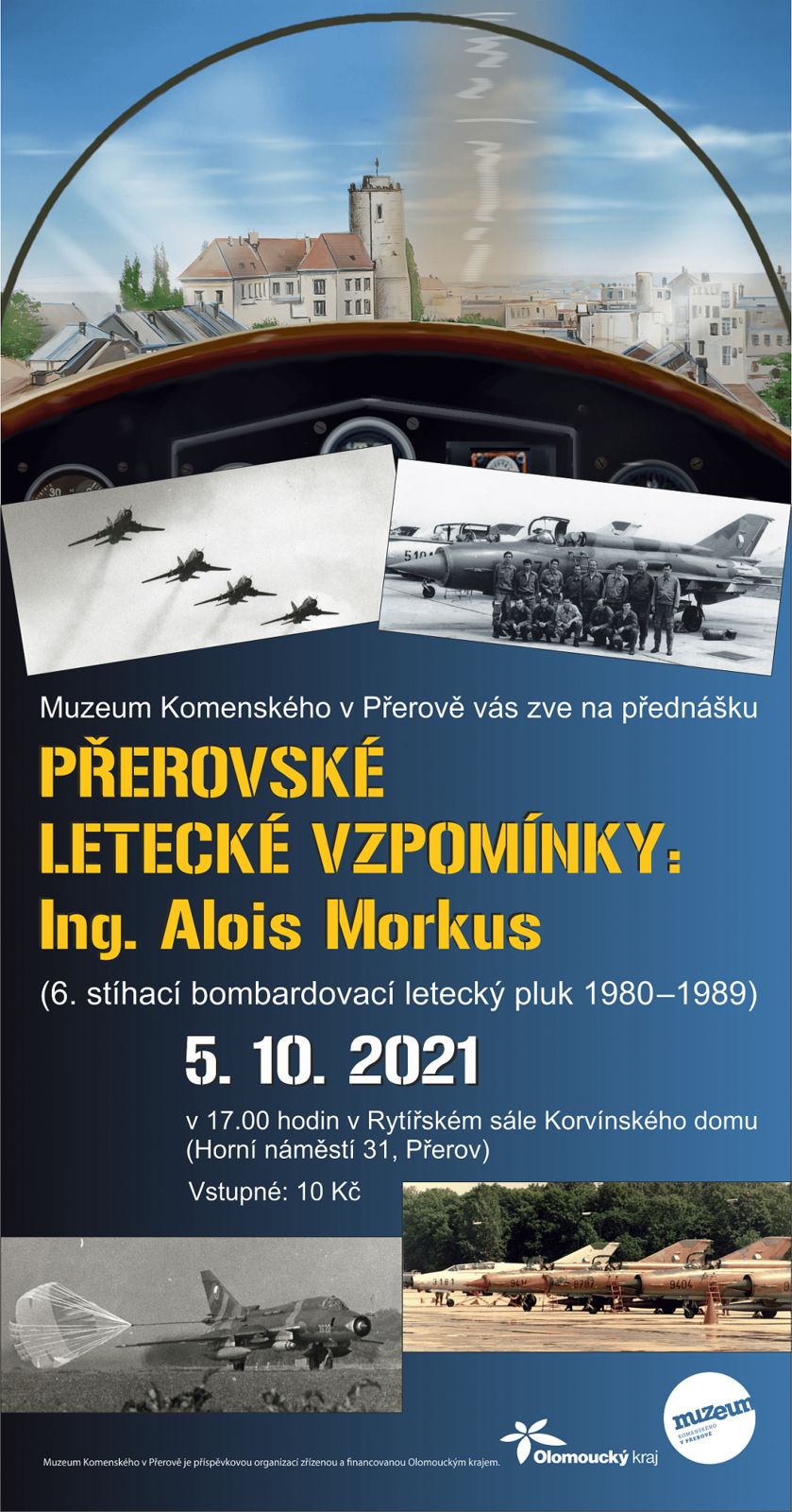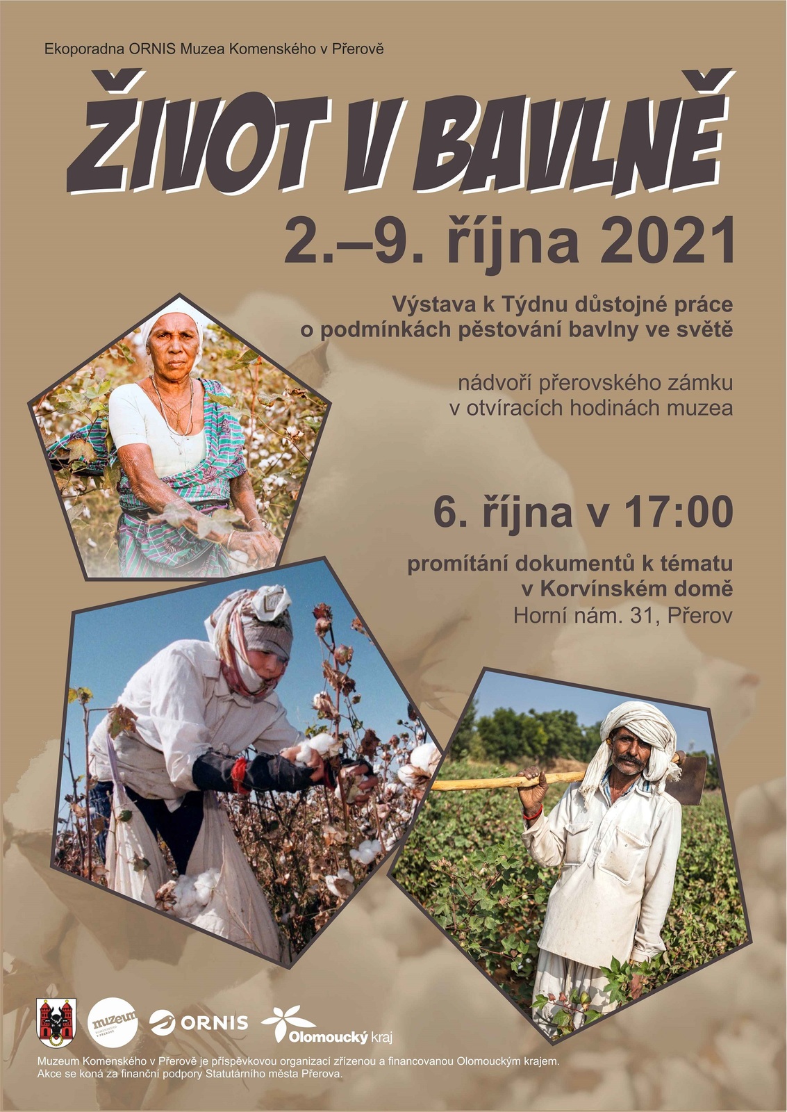 Muzeum Komenského v Přerově zveřejňuje program na měsíc říjen 2021 a společně s ním i pozvánku na přednášku Přerovské letecké vzpomínky: Ing. Alois Morkus, která proběhne 5. října od 17 hodin v Korvínském domě. Od 2. do 9. října můžete navštívit na nádvoří přerovského zámku výstavu Život v bavlně, která dokumentuje podmínky pěstování bavlny ve světě. Ve středu 6. října od 17 hodin pak v Korvínském domě proběhne promítání dokumentů k tomuto tématu. V sobotu 9. října Vás srdečně zveme na Ptačí festival Záhlinice a 14. října od 16.30 na přednášku Marcely Janské Čeho se dokážete zbavit dnes, neschovávejte na jindy. Ornitologická stanice si na 15. října od 16 hodin připravila výtvarnou dílnu, kde si ze spékaného skla budete moci vyrobit Skleněnou rybu. Ve středu 20. října Vás zveme na prohlídku parku Michalov při příležitosti oslavy Dne stromů a 22. října od 19 hodin do přerovského zámku na komorní koncert klasického dechového tria.