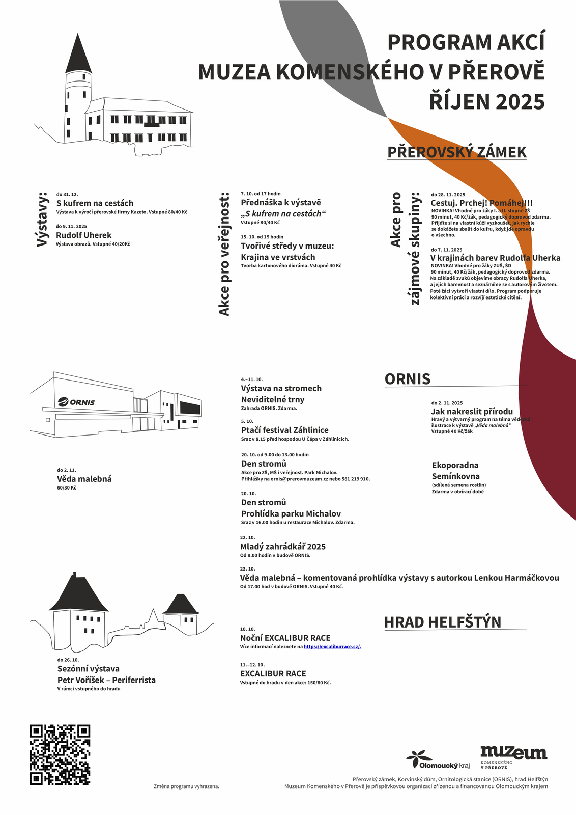 Muzeum Komenského v Přerově nabízí v měsící říjnu řadu kulturních, vzdělávacích i přírodovědných akcí. Rádi bychom Vás pozvali na ty nejvýznamnější z nich. Na přerovském zámku pokračuje výstava S kufrem na cestách, která představuje historii firmy Kazeto a fenomén přerovských kufrů. Do 9. listopadu je také otevřena výstava Rudolf Uherek – Ze života. V úterý 7. října připravujeme přednášku k výstavě S kufrem na cestách s kurátorem Mgr. Petrem Sehnálkem od 17.00 hodin.