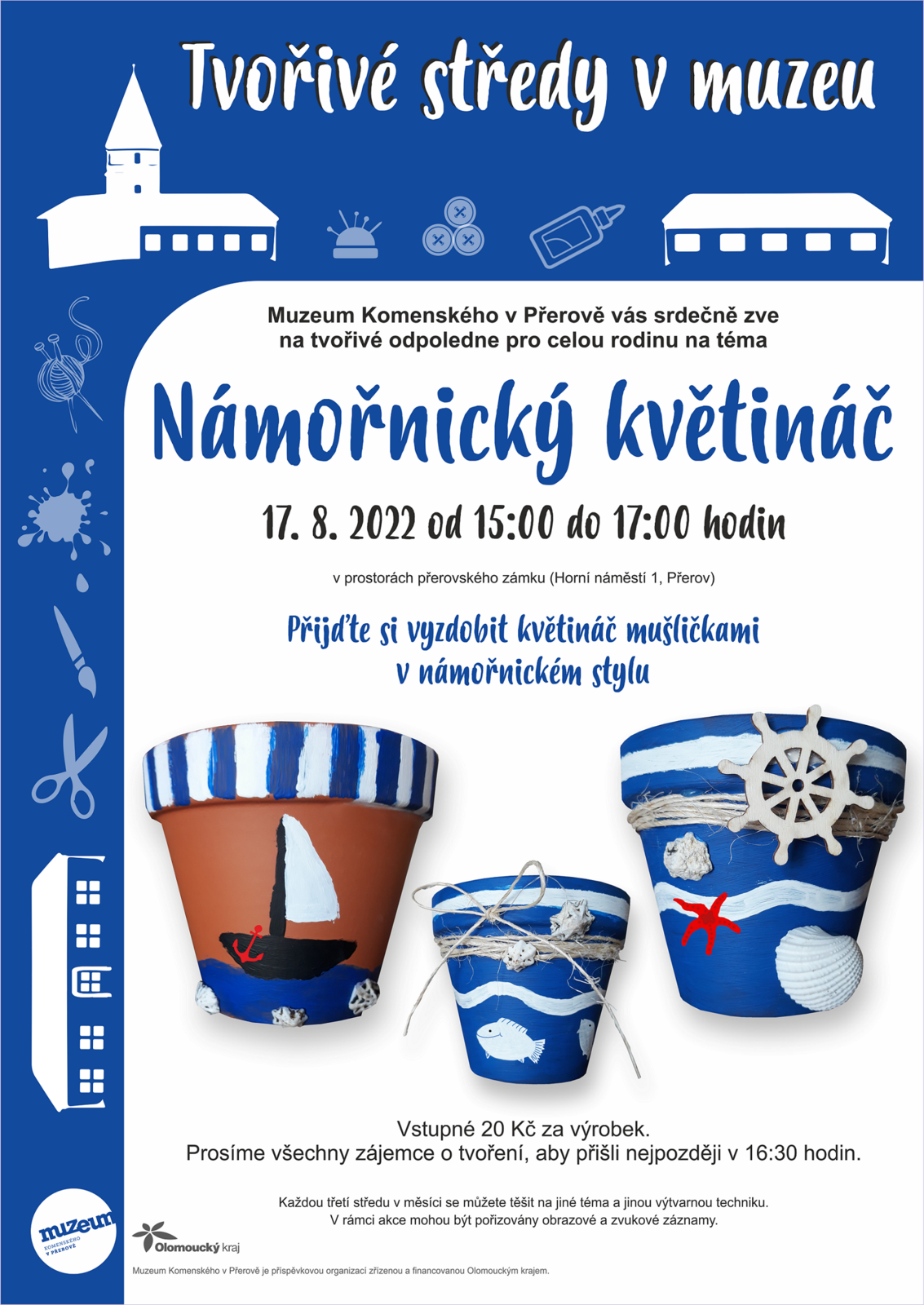 Muzeum Komenského v Přerově představuje program na měsíc srpen 2022 a společně s ním i pozvánku na výstavu Modlitby autorky Dagmar Havlíčkové, jejíž vernisáž proběhne ve čtvrtek 11. srpna od 17 hodin v přerovském zámku. Ve středu 17. srpna od 15 hodin pro Vás připravujeme tvořivé odpoledne pro celou rodinu, kde si budete moci nazdobit květináč v námořnickém stylu. Na konci srpna Vás srdečně zveme na hrad Helfštýn na jubilejní 40. ročník Hefaistonu a Kovářké fórum, které proběhne v týdnu před Hefaistonem od 21. do 26. srpna.