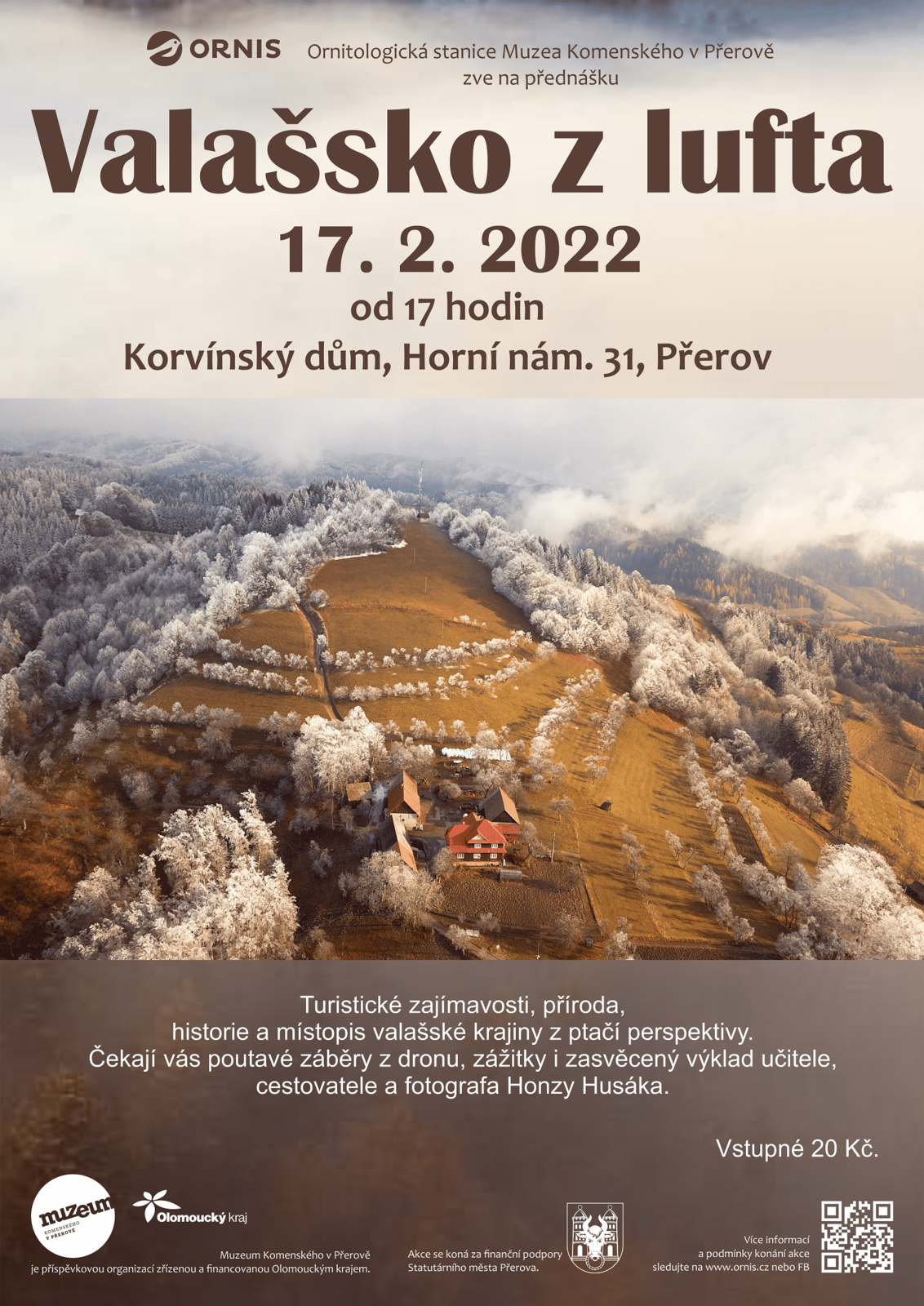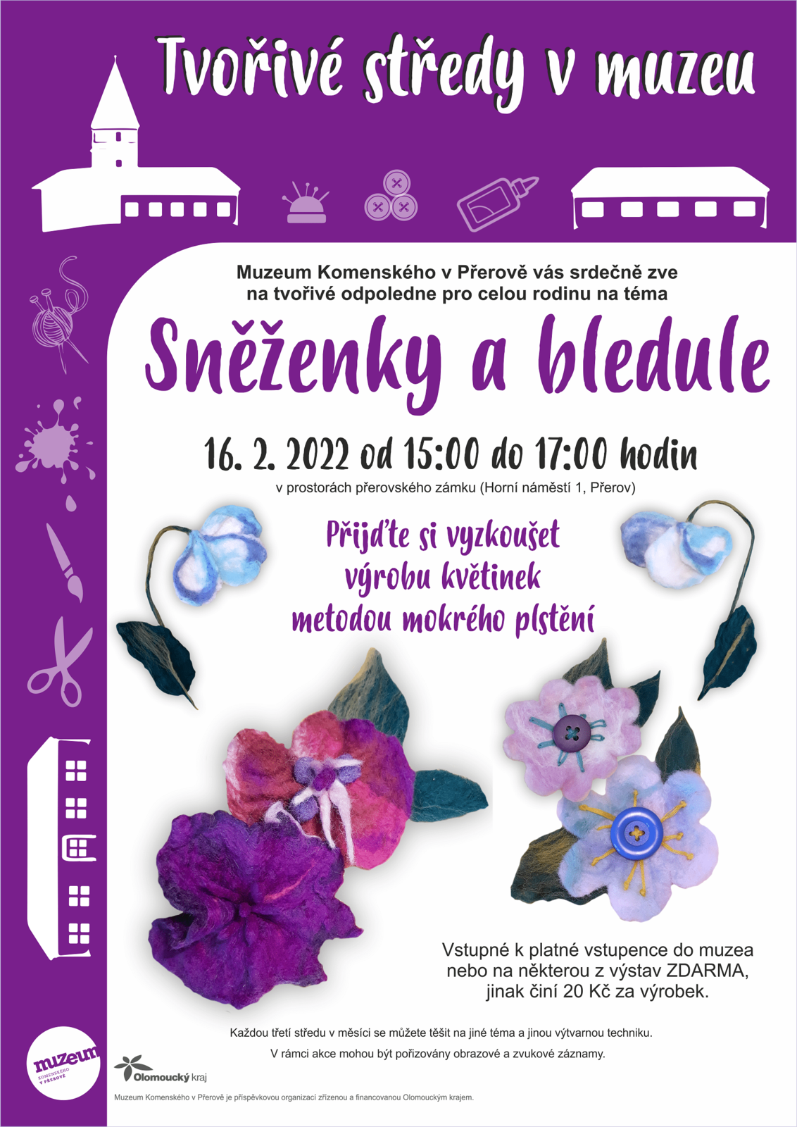 Muzeum Komenského v Přerově zveřejňuje program na měsíc únor 2022. Společně s ním pozvánku ornitologické stanice na 5. února od 9.30 na exkurzi kolem řeky Bečvy s povídáním na téma "Krmit či nekrmit?" vodní ptáky ve městě. V pátek 11. února od 19 hodin a v sobotu 12. února od 9 do 12 hodin proběhne v prostorách Korvínského domu Swap: výměnný bazar jarního oblečení. Ve středu 16. února od 15 do 17 hodin Vás srdečně zveme na Tvořivé středy v muzeu: Sněženky a bledule, kde si metodou mokrého plstění budete moci vytvořit květiny. Ve čtvrtek 17. února od 17 hodin se uskuteční přednáška Valašsko z lufta, na které Vás kromě povídání o historii a turistických zajímavostech čekají i poutavé záběry z dronu. Více na přiloženém letáčku či odkaze: www.prerovmuzeum.cz