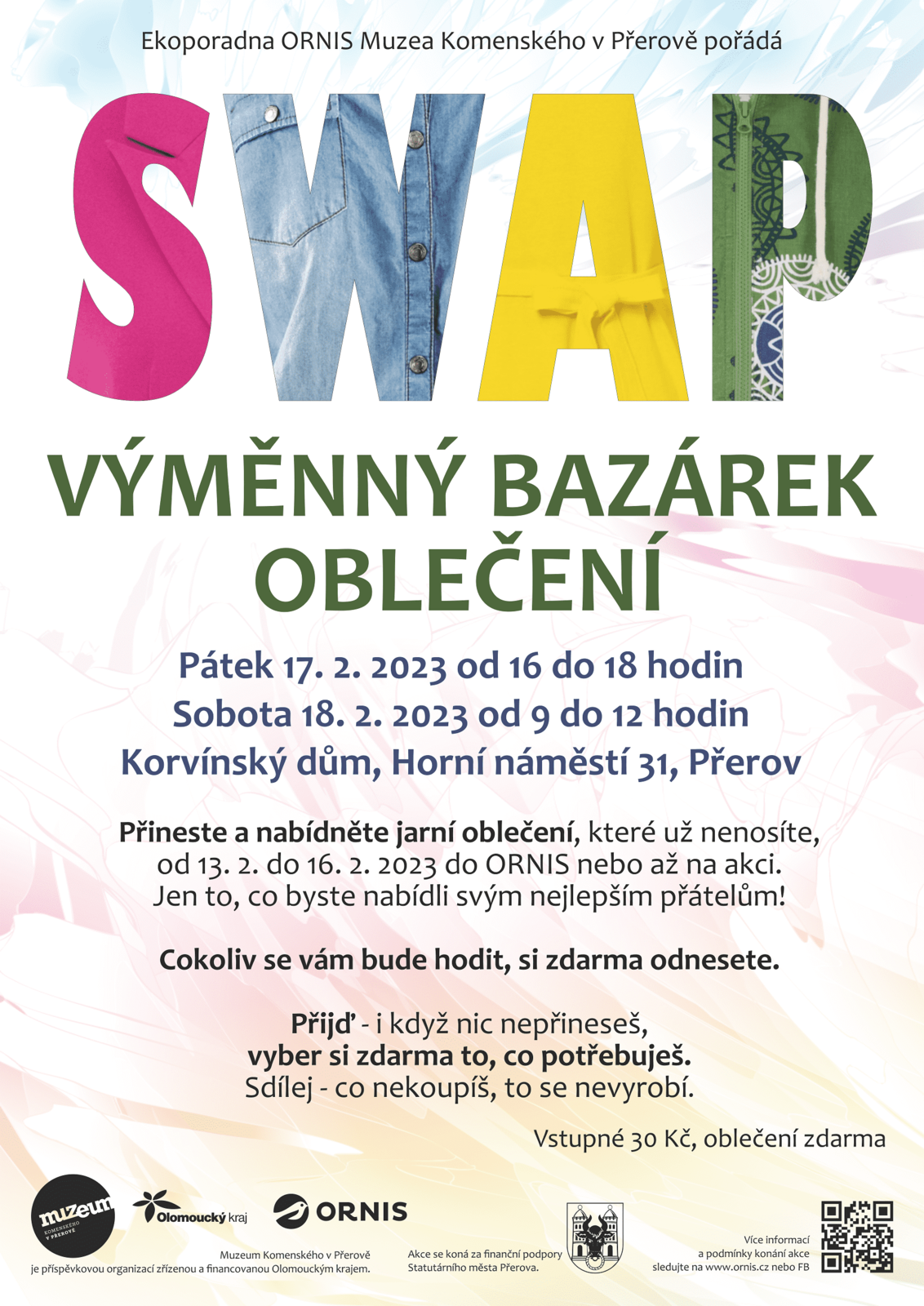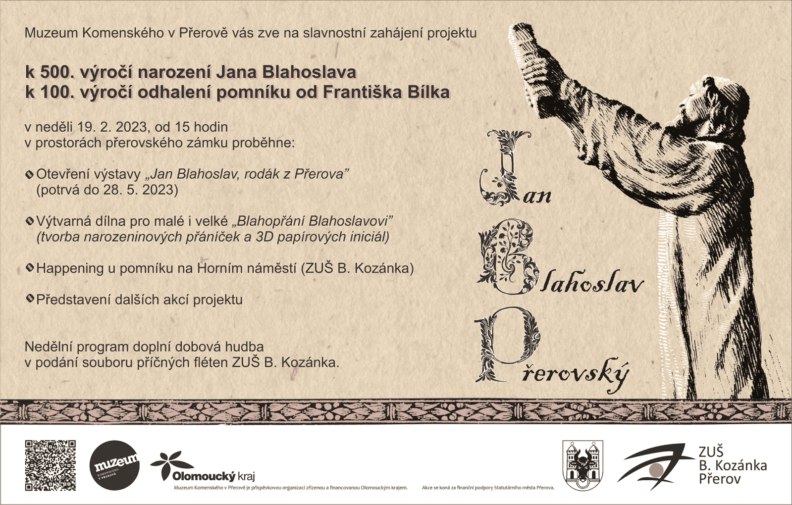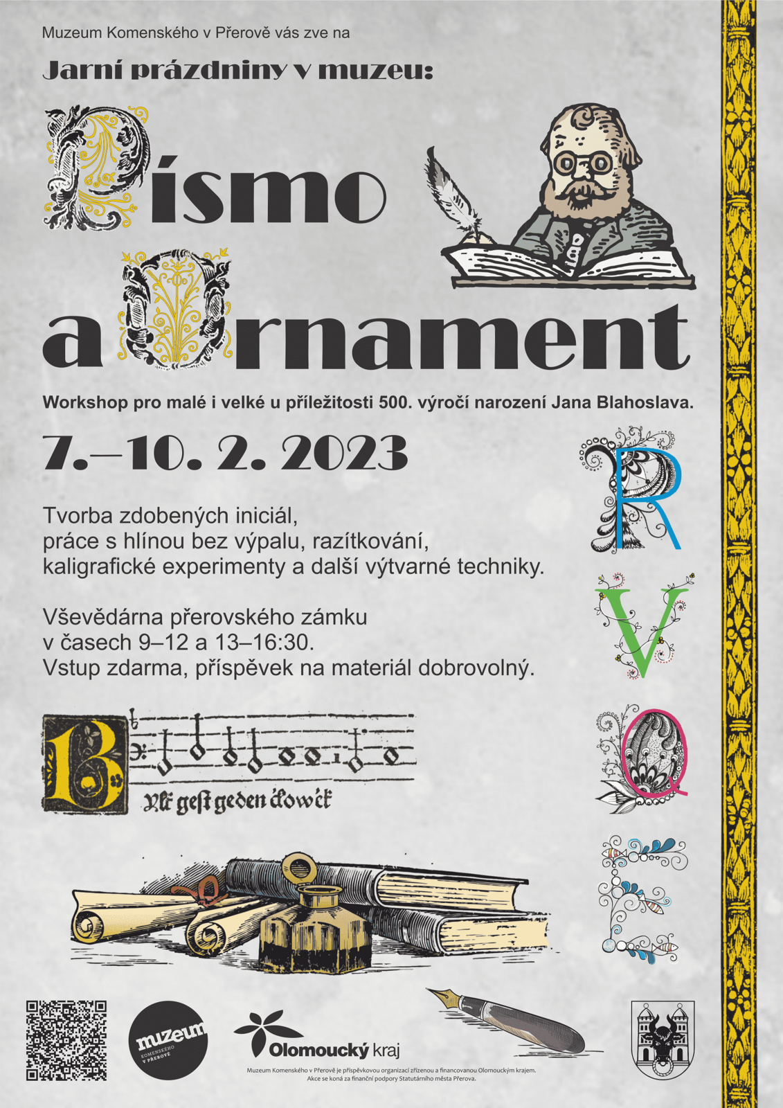Muzeum Komenského v Přerově představuje proram na měsíc únor 2023 a společně s ním i pozvánku na výstavu prací dětí z okresního kola výtvarné soutěže Krása a zdraví ze zahrady, kterou budete moci navštívit od 1. února. Od 7. do 10. února Vás zveme na workshop Písmo a ornament, vždy v časech od 9.00 do 12.00 a od 13.00 do 16.30. Ekoporadna ORNIS pořádá 17. a 18. února SWAP výměnný bazárek oblečení. V neděli 19. února od 15 hodin proběhne slavnostní zahájení projektu k 500. výročí narození Jana Blahoslava a k 100. výročí odhalení pomníku od Františka Bílka. Můžete se těšit na otevření výstavy Jan Blahoslav, rodák z Přerova, na výtvarnou dílnu pro malé i velké, happening u pomníku a představení dalších akcí v rámci projektu. Ve čtvrtek 23. února bude slavnostní vernisáží od 17 hodin zahájena výstava Ljubomír Burian Vzpomínky.