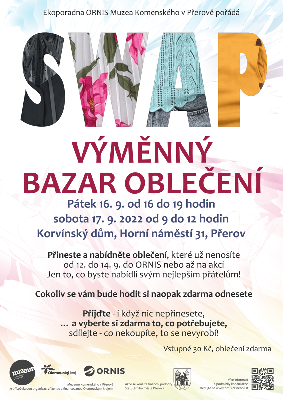 Muzeum Komenského v Přerově představuje program Muzea Komenského v Přerově na měsíc září 2022. Zároveň zve na výstavu školních obrazů Podzim, kterou budete moci navštívit už od 1. září 2022. Od 9. září bude probíhat výstava výtvarných prací studentů Střední průmyslové školy stavební v Lipníku nad Bečvou Kdo? JAK! Aneb Komenský všude kam se podíváš!. Výstava bude zahájena ve čtvrtek 8. září od 17 hodin vernisáží v prostorách zámku. Ekoporadna ORNIS si pro Vás v pátek 16. září od 16 hodin a sobotu 17. září od 9 hodin připravila SWAP výměnný bazar oblečení.