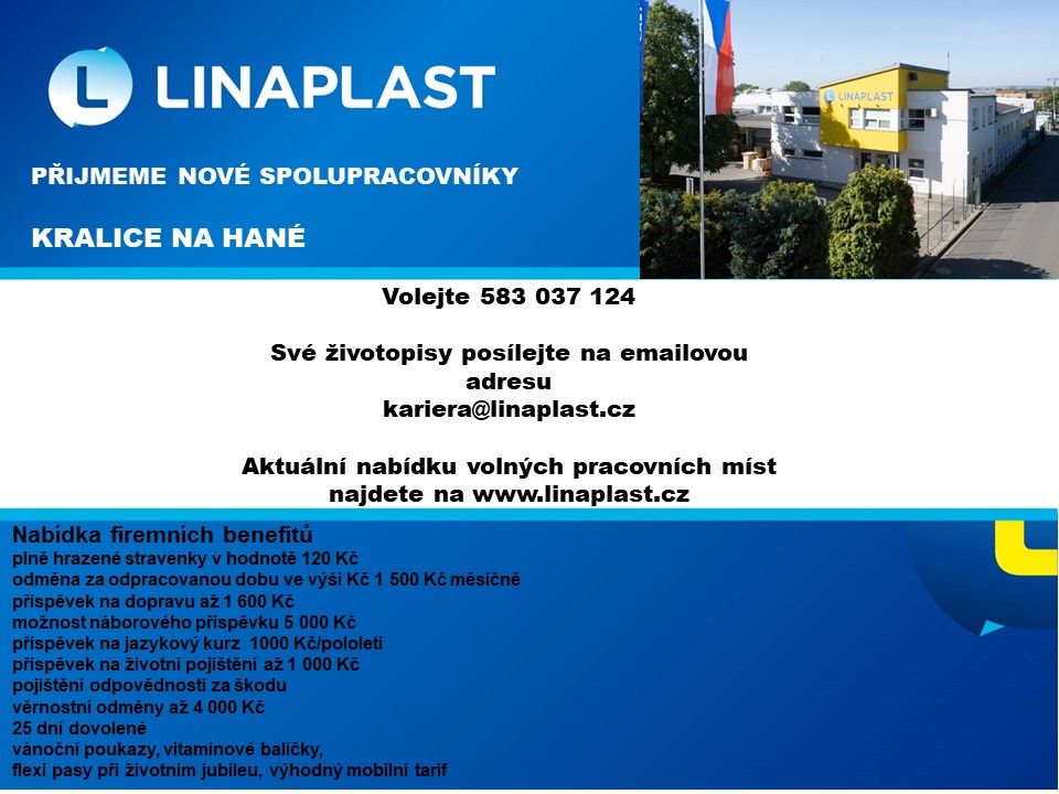 Společnost Linaplast s.r.o. Kralice na Hané nabízí volná pracovní místa. Více informací na přiloženém letáčku.