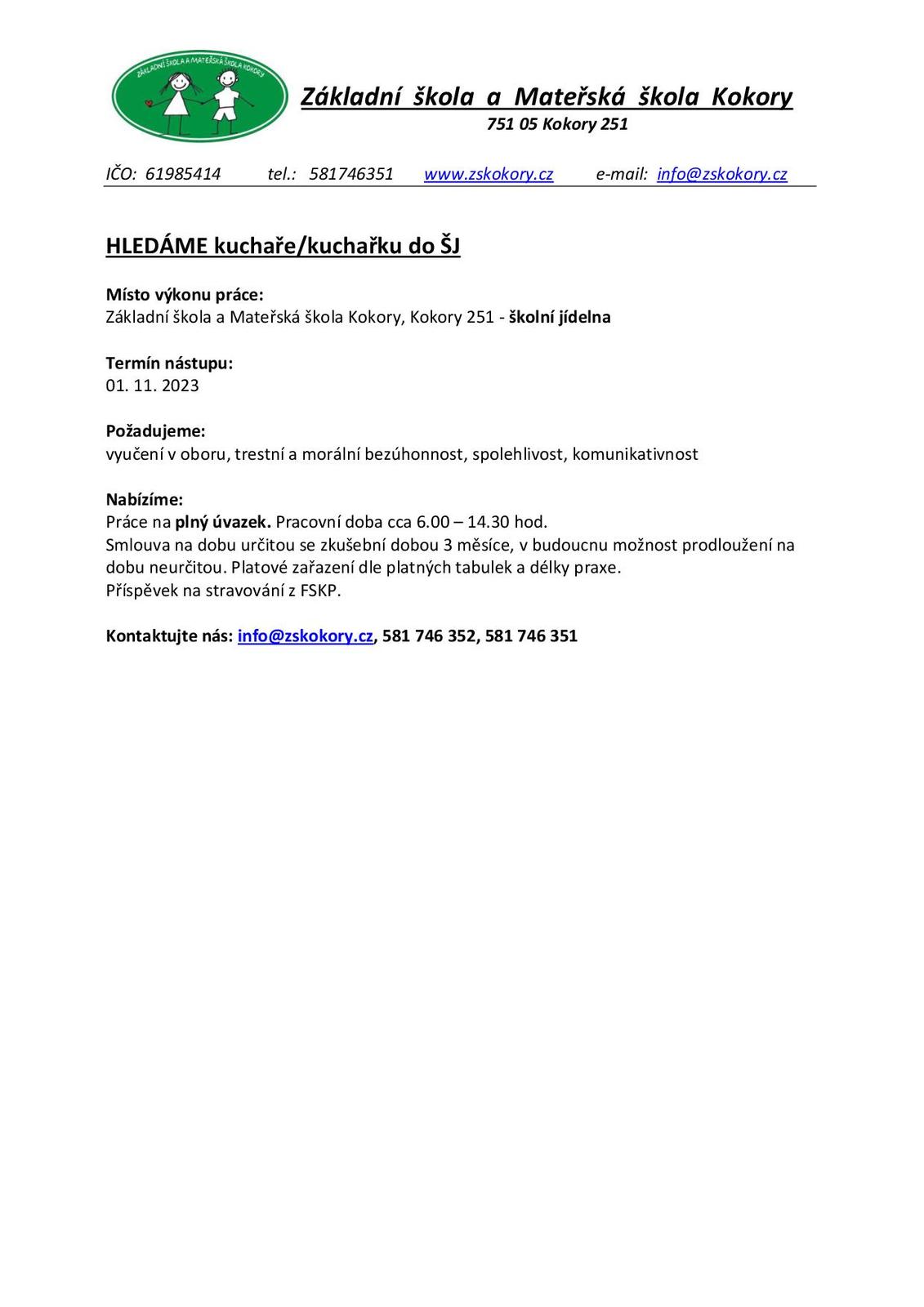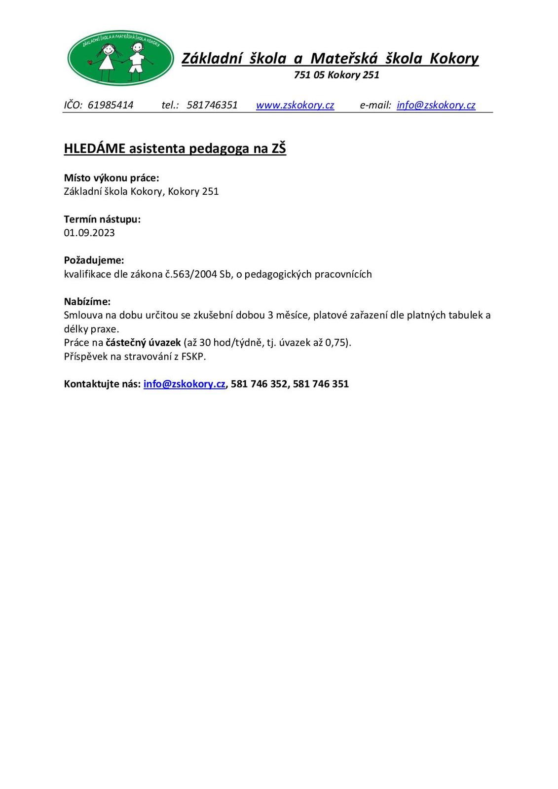 Úvod > Informace > Aktuality > Nabídka práce na pozici asistent pedagoga ZŠ Kokory a kuchař školní jídelny