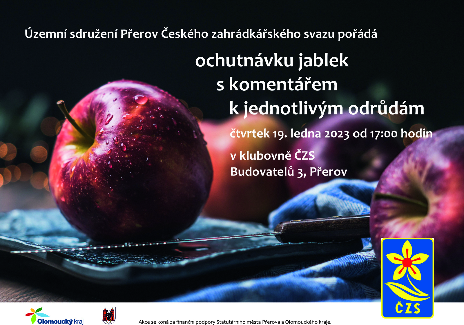 Základní organizace českého zahrádkářského svazu Citov zve na ochutnávku jablek s komentářem k jednotlivým odrůdám. Ochutnávka se uskuteční ve čtvrtek 19. ledna 2023 od 17:00 hodin v klubovně ÚSČZS Přerov, ul.Budovatelů 3.