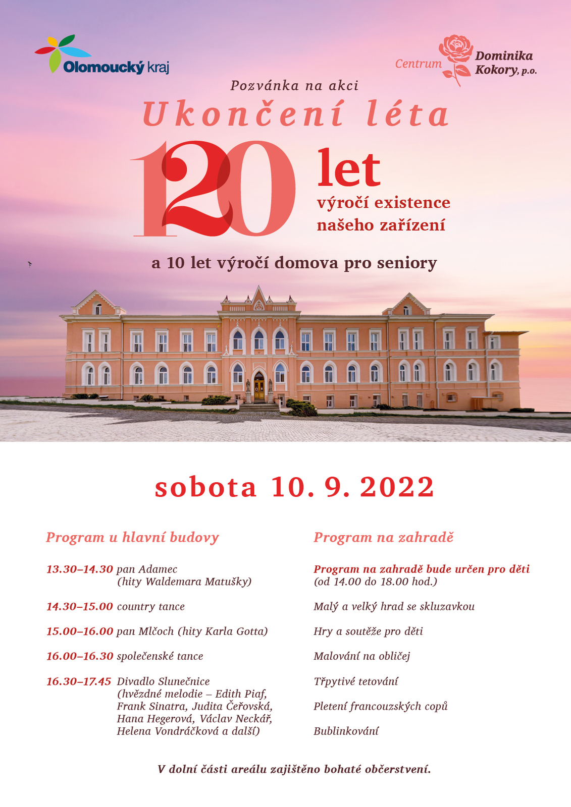 Obec Kokory zve v sobotu 10.9.2022 na akci Ukončení léta. Byť je v sobotu cyklovyjížďka, ne všichni občané jsou cyklisti, tak jste zváni do Centra Dominika na oslavu 120 let této instituce v Kokorách. Sobotní odpoledne bude plné kulturních vystoupení, zábavného programu pro děti a dobrého jídla a pití. Podrobný program na přiloženém letáčku.