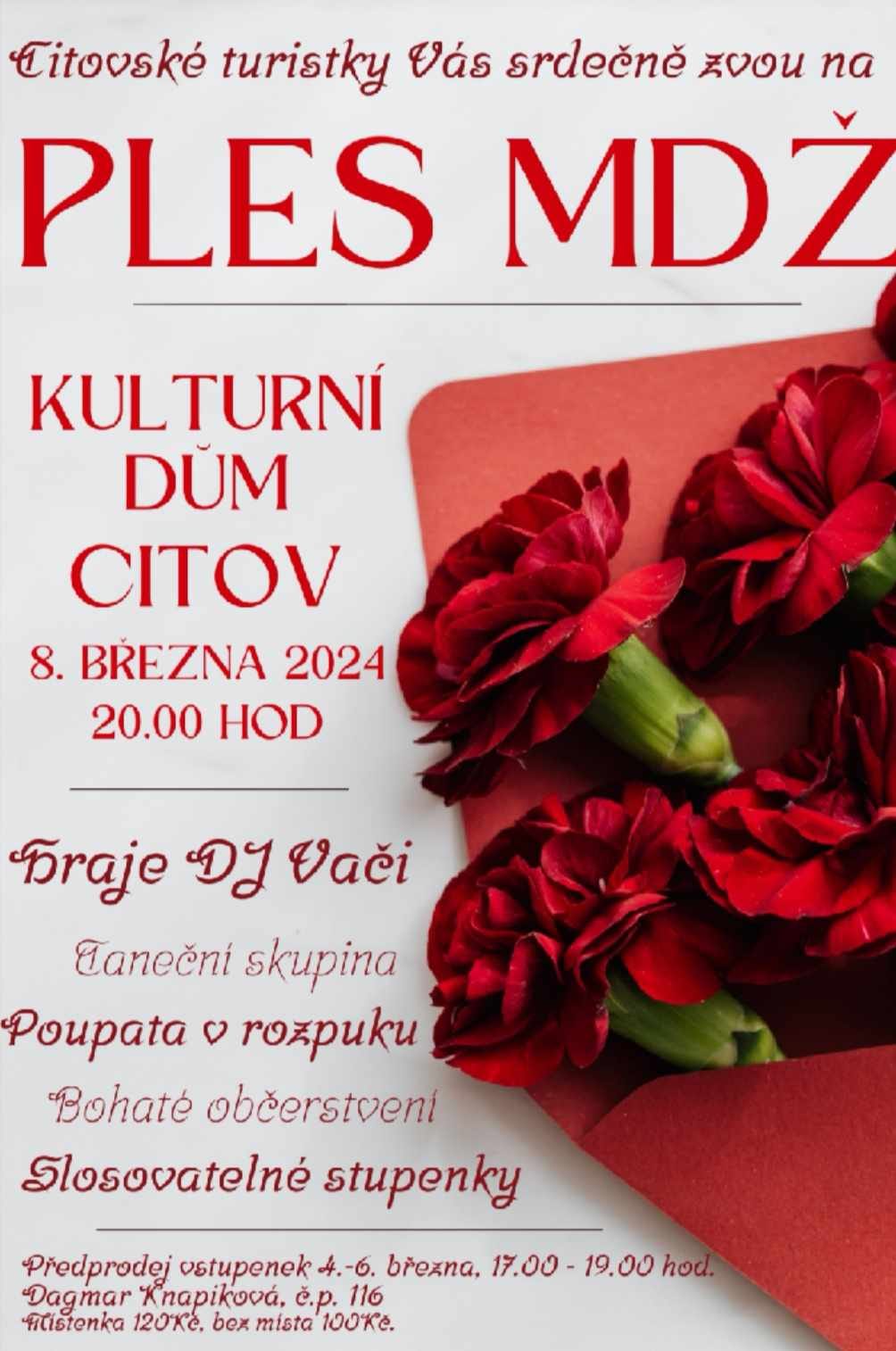 Citovské turistky vás zvou na Ples MDŽ, který se uskuteční v pátek 8. března 2024 v kulturním domě v Citově. Začátek ve 20 hod. Předprodej vstupenek 4.-6.3. u Dagmar Knapíkové. Další informace na přiloženém letáčku.