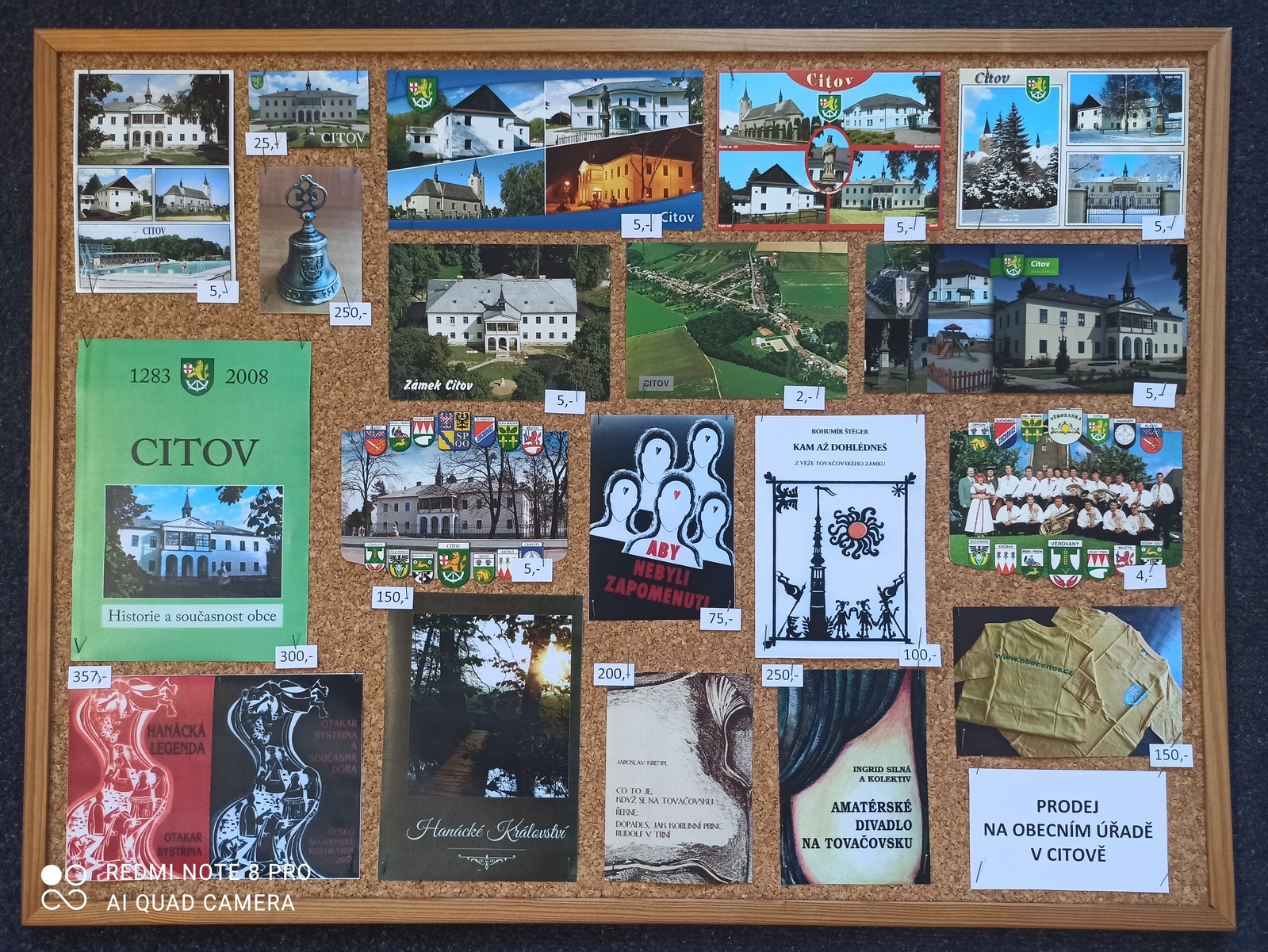Obec Citov nabízí k prodeji pohlednice obce Citov, knihy, trička a další předměty. Více informací v příloze.