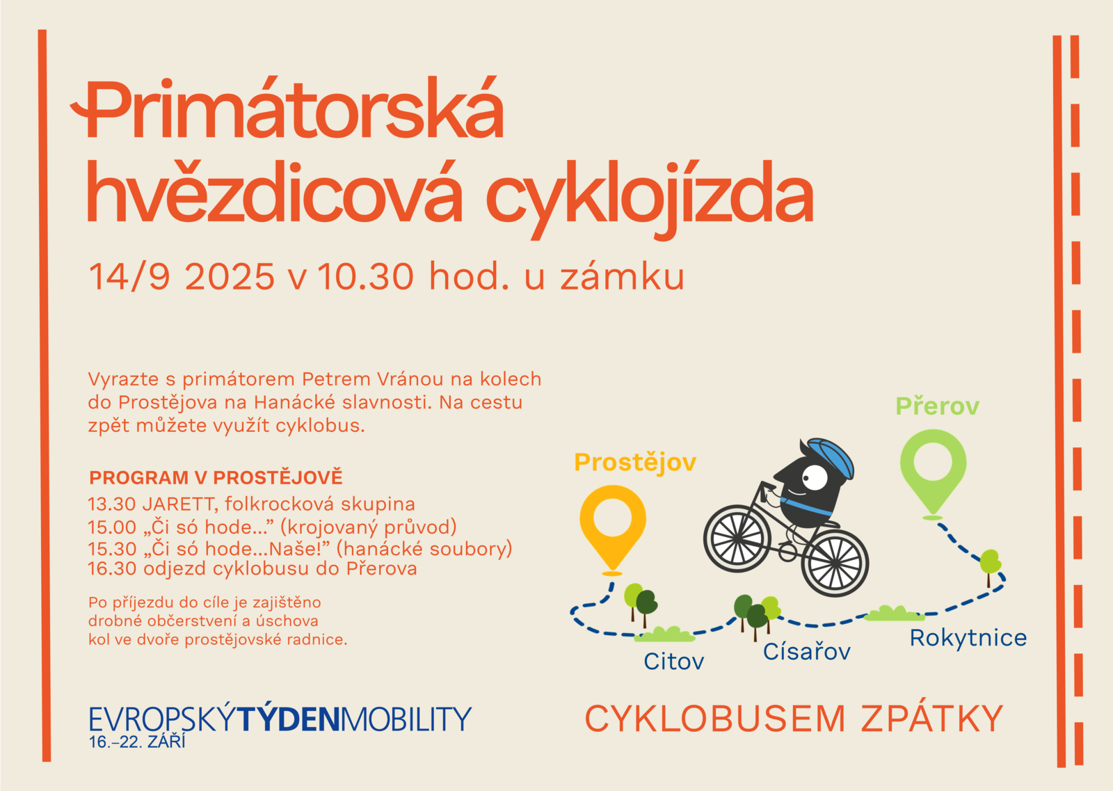 V letošním roce město Přerov obnovuje tradici Hvězdicové cyklojízdy primátorů, kdy cyklisté opět vyrazí na prostějovské hody. Hvězdicová jízda je naplánována v rámci Evropského týdne mobility na neděli 14. září. Z Přerova se bude vyrážet v 9 hodin a plánovaný příjezd do Prostějova je kolem 12.30 hod.