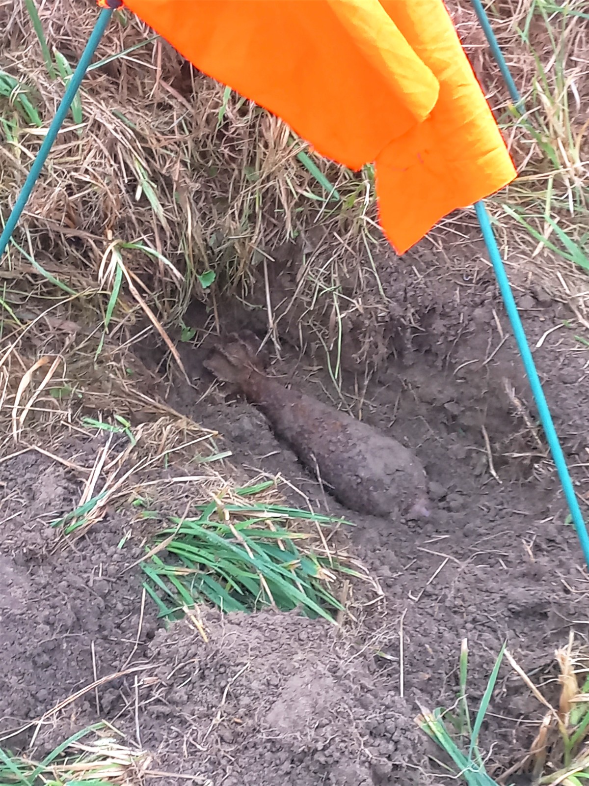 4) Skupina pyrotechnického ověření pomocí magnetometru a ručních detektorů identifikuje přesnou pozici zdroje detekovaného signálu a ověří jej ručně kopanou sondou. V průběhu provádění výkopu se pravidelně střídají operace kopání a měření. Odkrytý předmět je následně identifikován. Munice se předává policii proti zápisu do knihy nálezů. V případně, že rozsah výkopu přesahuje parametry ručně kopané sondy, je místo označeno a následně se prozkoumá pomocí bagru za přítomnosti pyrotechnika.