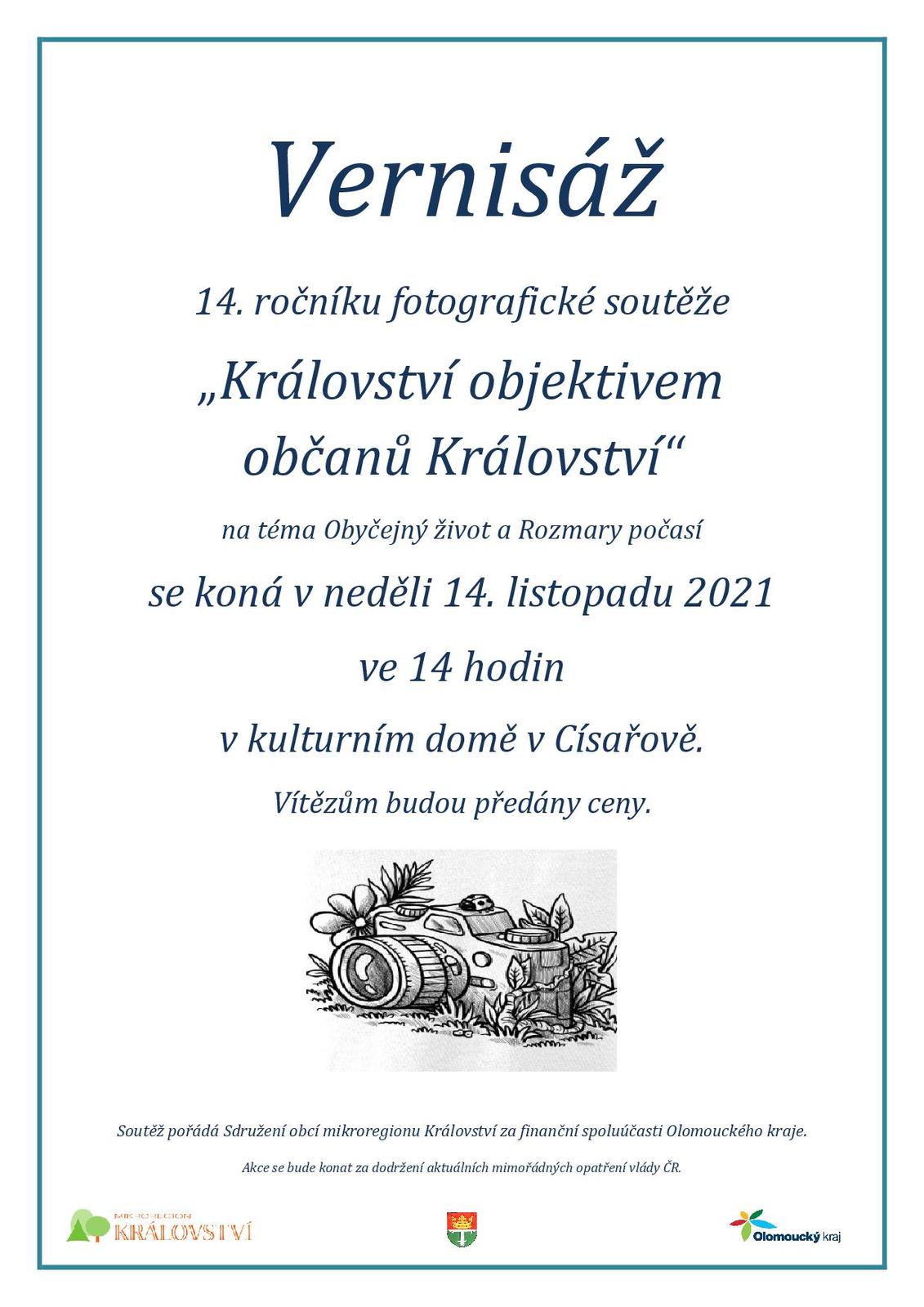 Sdružení obcí mikroregionu Království zve na vernisáž fotografické soutěže "Království objektivem občanů Království", která se koná v neděli 14.11.2021 ve 14 hod. v kulturním domě v Císařově. Více informací na přiloženém letáčku.