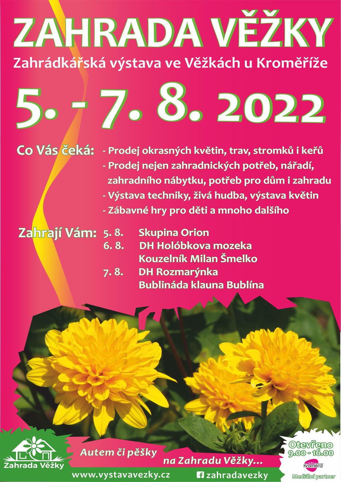 Srdečně Vás zveme na letní zahrádkářskou výstavu Zahrada Věžky, která se koná v termínu 5. – 7. srpna 2022, každý den od 9 do 16 hodin. Nakoupit si můžete květiny, stromky, potřeby pro dům i zahradu, řemeslné výrobky. Hudební vystoupení oblíbených kapel každý den, zábavný program pro děti a mnoho dalšího!