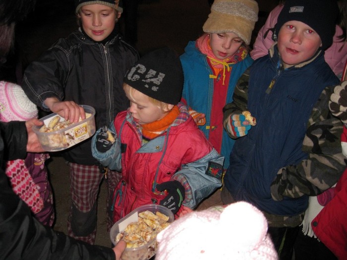 K těmto průvodům jsme se připojili i my – Pampeliška – klub pro maminky s dětmi. Aby děti věděly, proč je svatomartinský průvod konán, loni shlédly na faře scénku o sv. Martinovi a vymalovaly si známý listopadový obrázek od Mikoláše Alše, jak Martin sedí na koni, pod ním klečí žebrák a Martin mu podává plášť… Letos jsme se učili písničku o Martinovi. Pak se všichni oblékli, zapálili lucerničky, udělali společné foto a hurá do ulic. Vydali jsme se směrem ke mlýnu, ale vidět byly jen světýlka lucerniček. Během cesty jsme si zahráli hry, zazpívali písničky a proběhli jako koníci. Na konci cesty u mlýna čekalo na děti jako překvapení a zároveň pochutnání si na svatomartinském rohlíčku pečený jednou z maminek, které tímto moc děkujeme. Posilněni jsme se odebrali do svých domovů